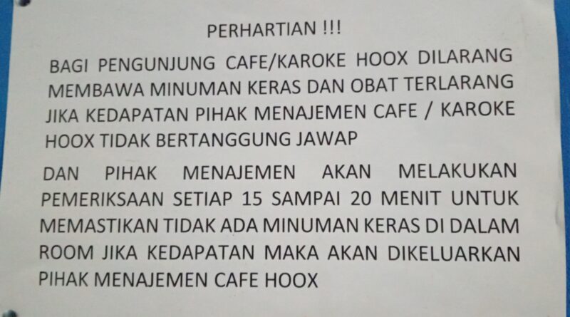 Ruangcoretan.com – Pajangan informasi larangan membawa minuman keras (miras) yang terpampang di area Kafe Hox diduga hanya sebatas formalitas. Pasalnya,